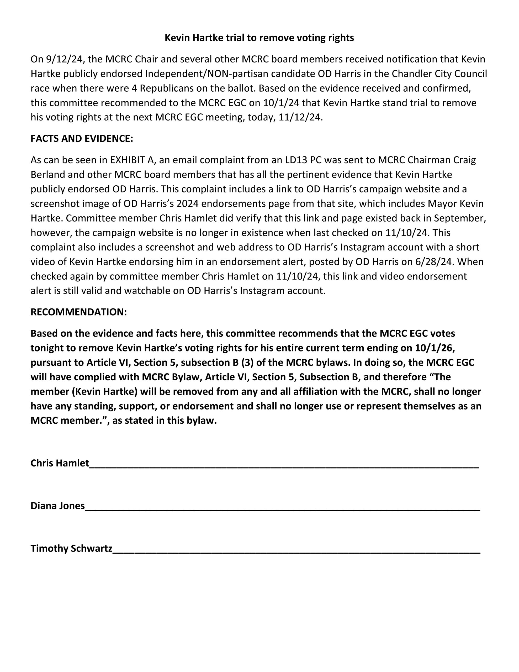Pursuant to MCRC Bylaws, Article VI, Section 5 (B), the MCRC Executive Guidance Committee (EGC) met on November 12, 2024 where, in Executive Session, a trial was conducted and evidence was presented, charging Precinct Committeeman Kevin Hartke with publicly endorsing Independent/NON-partisan candidate OD Harris in the Chandler City Council race when there were 4 Republicans on the ballot. The censure against Hartke failed and it was voted on to keep that in executive session.
