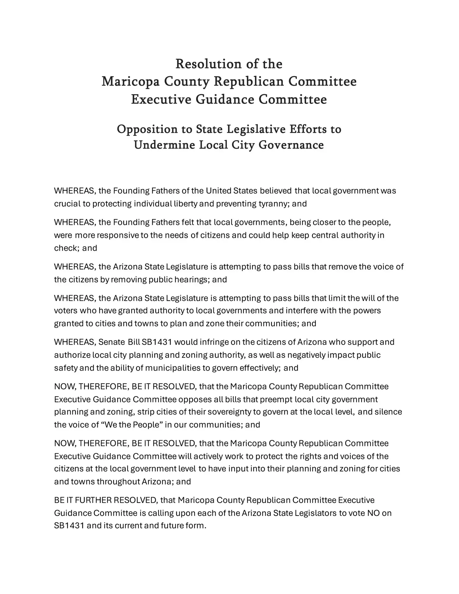 Last night, the MCRC Executive Guidance Committee held it’s monthly meeting where, among other business, they unanimously passed a resolution opposing SB1431 which has now moved into the House for a vote. The EGC strongly encourages all Precinct Committeemen and voters to contact their Legislators and express your opposition as well. The text of the resolution can be found below as well as a link to the directory of AZ House Members and their contact information. Click HERE for a list of all legislators and contact info.